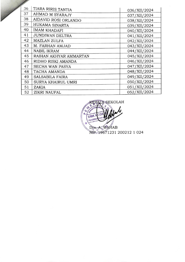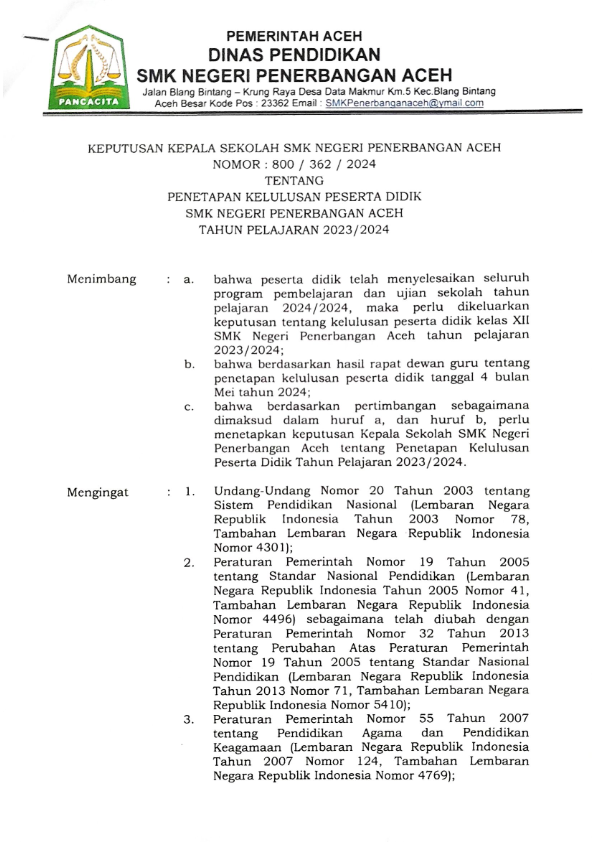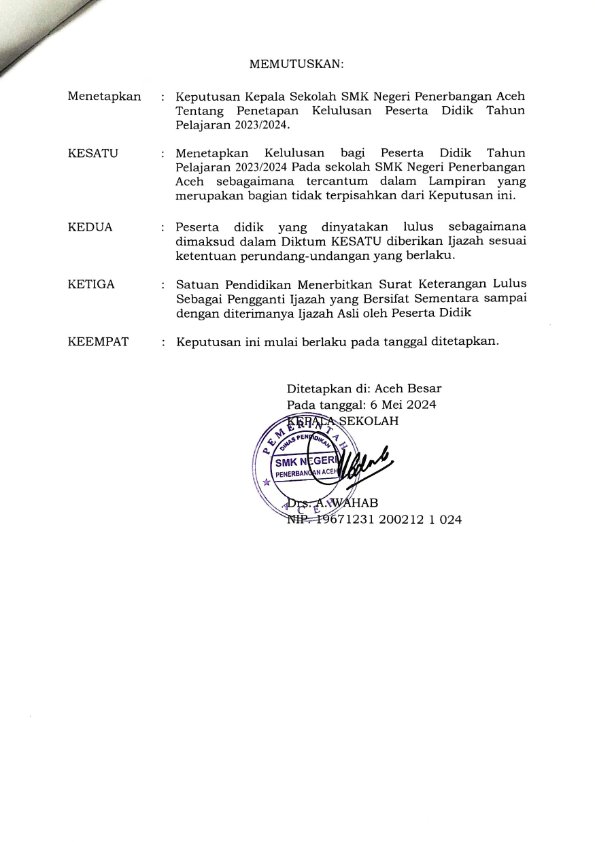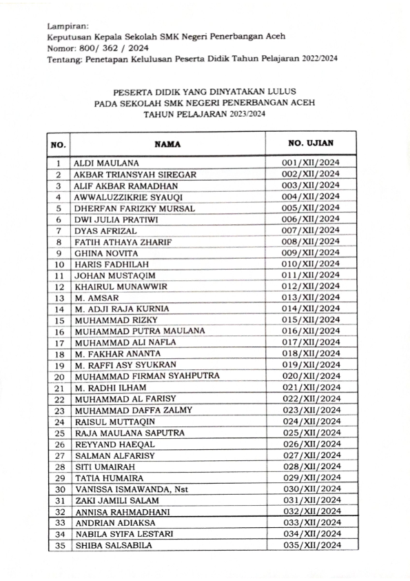 PENGUMUMAN KELULUSAN TARUNA/I SMK NEGERI PENERBANGAN ACEH ANGKATAN XII 2024